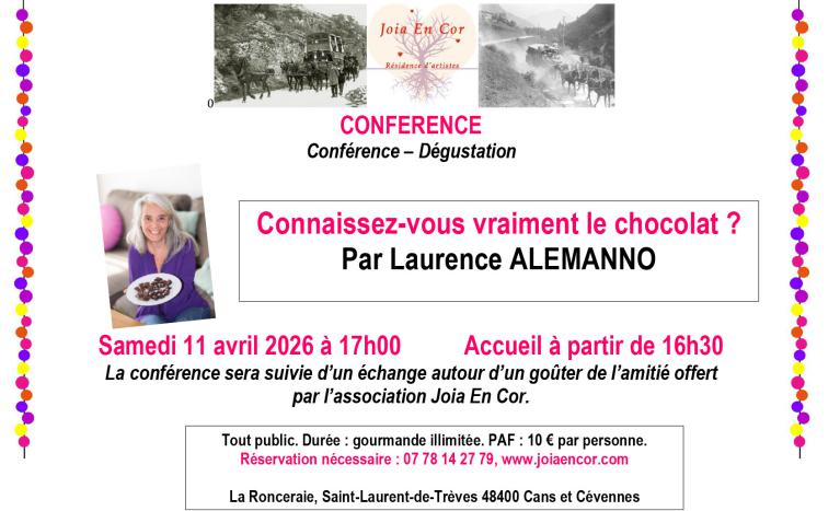 Par rapport à sa précédente conférence du 14 décembre 2024 à La Ronceraie, Laurence abordera plus spécifiquement les problèmes liés à la culture du cacaoyer et des alternatives au chocolat industriel, pour une consommation plus responsable, et plus agréable gustativement