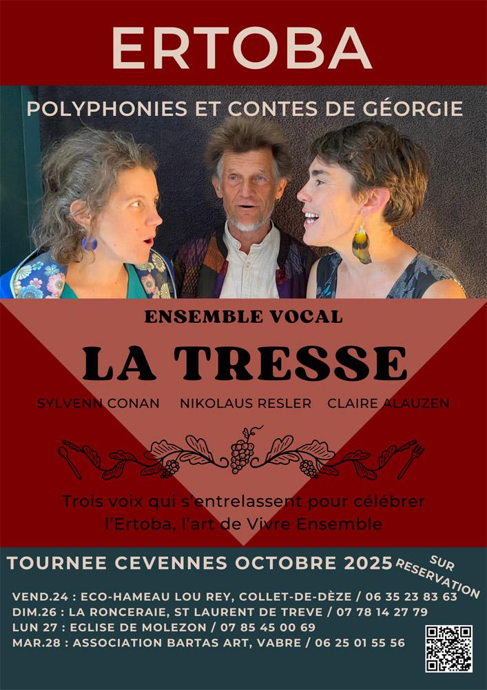Dimanche 26 octobre à 18h00, spectacle « Ertoba » : polyphonies et contes de Géorgie avec Sylvenn Conan, Nikolaus Resler et Claire Alauzen