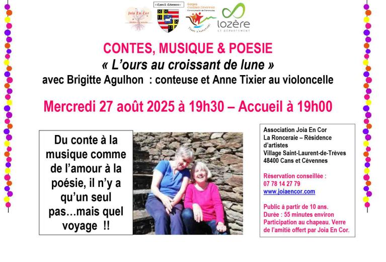 Mercredi 27 août à 19h30 : Soirée contée poétique et musicale « L’ours au croissant de lune » avec Brigitte Agulhon : conteuse et Anne Tixier au violoncelle
