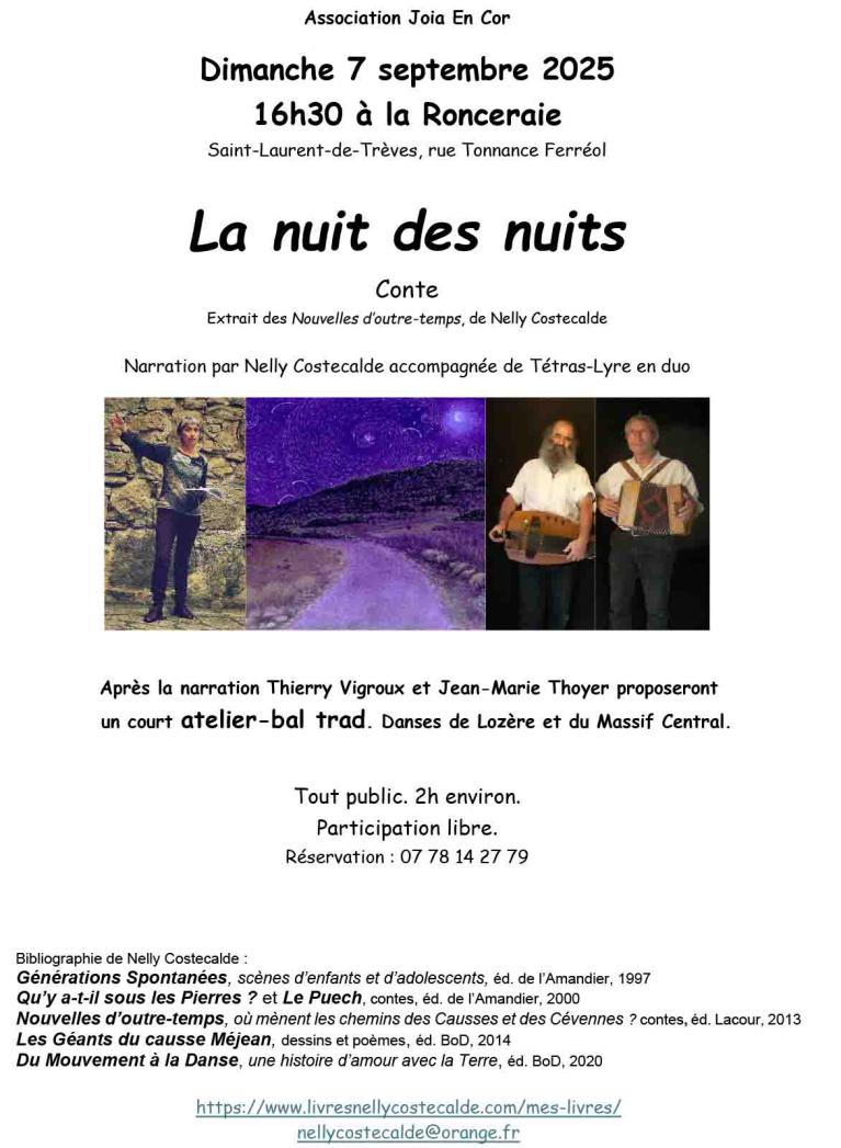Dimanche 7 septembre à 16h30 : Lecture du conte « La nuit des nuits » par Nelly Costecalde, suivie d’un atelier bal trad : danses de Lozère et du Massif Central avec Thierry Vigroux et Jean-Marie Thoyer.